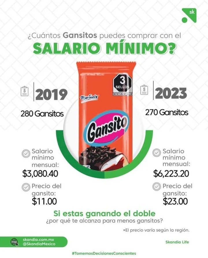 La siguiente imagen fue publicada por Skandia, una empresa sueca que ofrece servicios financieros como seguros y gestión de activos, y compartida por el mismo Arturo Herrera en sus redes sociales. En la imagen podemos apreciar que supuestamente el precio del gansito se encontraba en $11 pesos mexicanos en el año 2019 y $23 pesos en el 2023, un incremento de 109% en tan solo 4 años. Por lo tanto, incluso con los aumentos en el salario mínimo, en el 2023 se pueden comprar 10 gansitos menos que en el 2019, disminuyendo el poder adquisitivo del salario en términos de gansitos. Si bien esta imagen pretende responder a la pregunta «¿Cuántos gansitos puedes comprar con el salario mínimo?» con la declaración al final de la imagen («si estas ganando el doble ¿Por qué te alcanza para menos gansitos?») se busca desestimar los aumentos en el salario mínimo y sostener la idea que la inflación se encuentra por encima de lo que no están contando. No es descabello asegurar que esta imagen sugiere que en esos 4 años el nivel de precios de los bienes y servicios ha incremento en 109%, es decir, 20.25% anualmente; contrastando con el 28.49% entre diciembre de 2018 al mismo mes del 2023 según cifras del Instituto Nacional de Estadísticas y Geografía (INEGI).